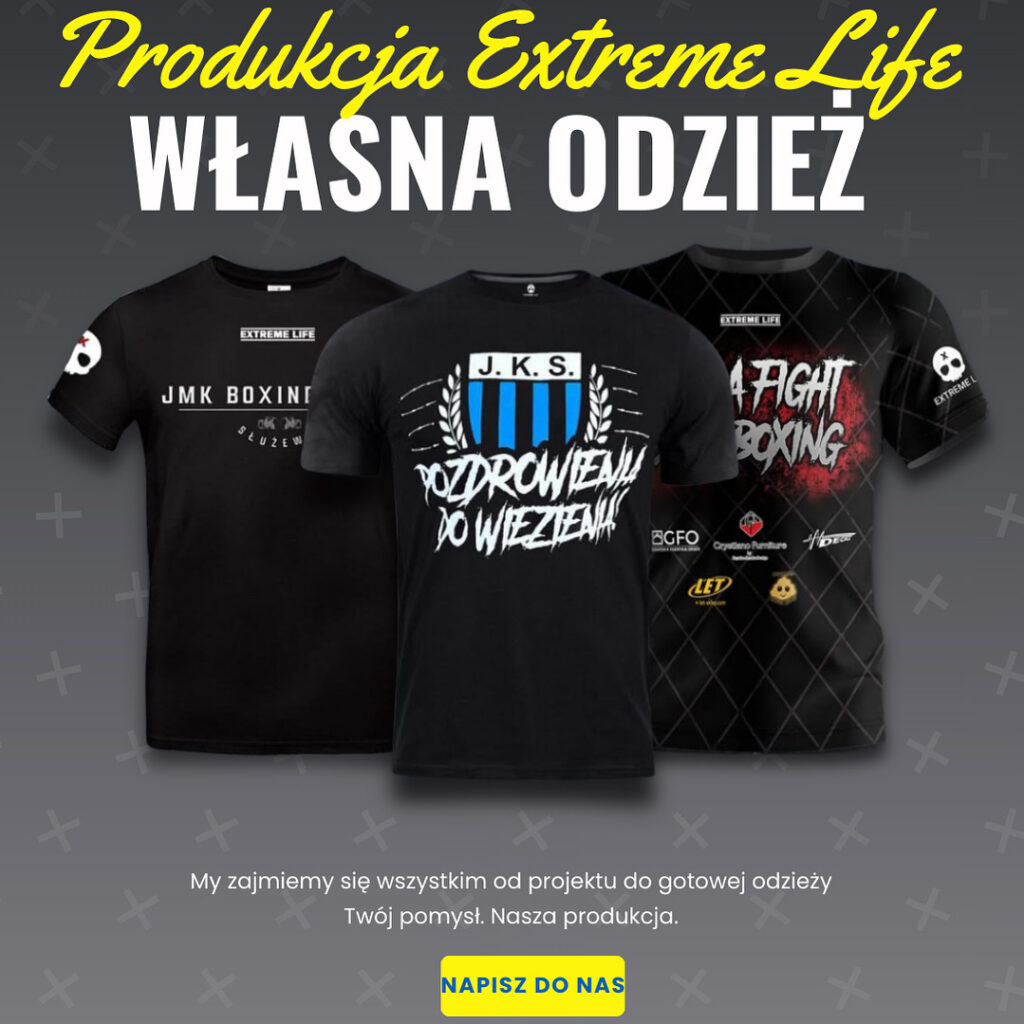 Produkcja PRODUKCJA OFERUJEMY Produkcja odzieży dla klubów i kibiców. Zniżki na produkty naszej marki Extreme Life dla wszystkich członków współpracującego klubu. Wspieranie zawodników w udziale w zawodach i galach. W sprawie kontaktu prosimy pisać na e-mail extremelifeshop@wp.pl. PRZYKŁADOWA REALIZACJA